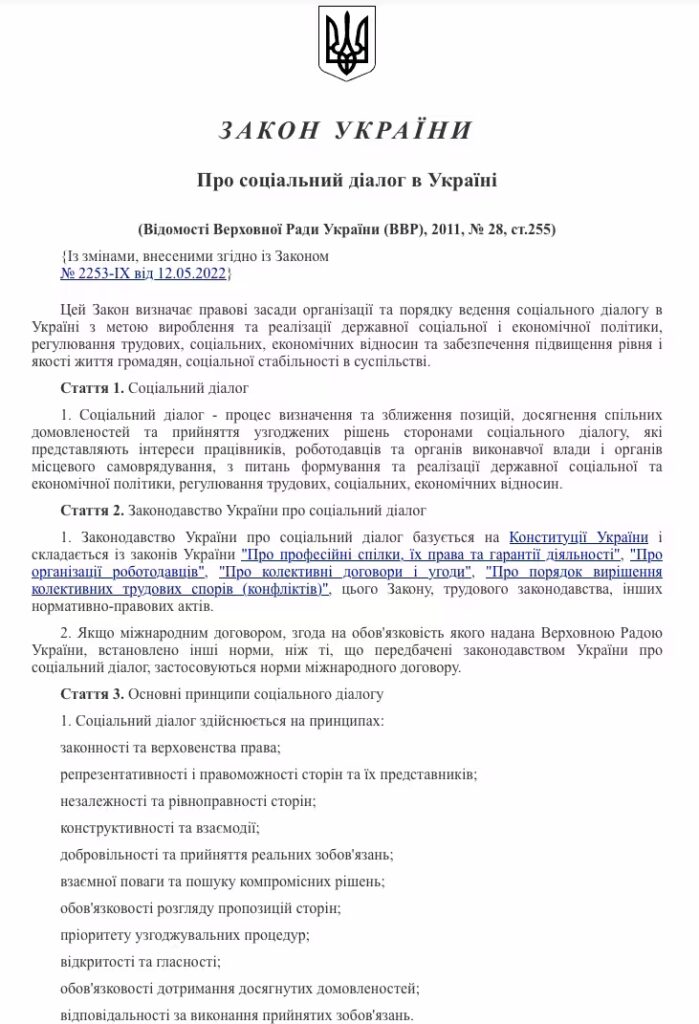 “Стаття 1.5. Профспілка діє згідно з Конституцією України, Законами України: «Про професійні спілки, їх права та гарантії діяльності», «Про Національну поліцію», «Про соціальний діалог в Україні», «Про колективні договори і угоди», чинним законодавством про органи внутрішніх справ, трудовим законодавством, іншими законами та нормативно-правовими актами України, загальноприйнятими нормами і принципами міжнародного права, конвенціями Міжнародної організації праці та цим Статутом.”